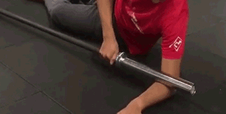 Sit on the ground on your back, put your legs on the barbell bar, support the ground with your hands back, and then move your body to roll up below your knees and down above your ankles for 20 to 30 seconds.