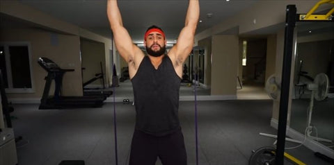 Then bring the resistance band behind your head. Begin to raise the arm to stretch the arm. Do the movements slowly, and you can exercise your muscles better.
