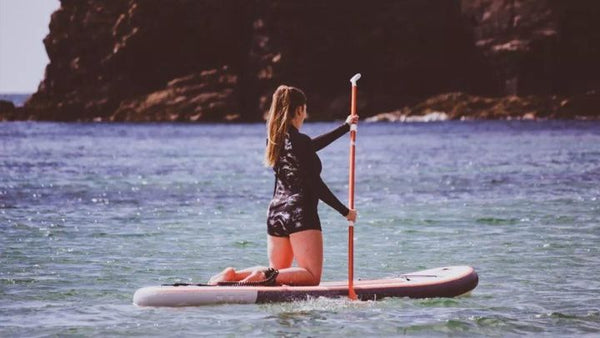 3: Kneel on the middle and back of the board, and then put the paddle flat on the paddleboard.